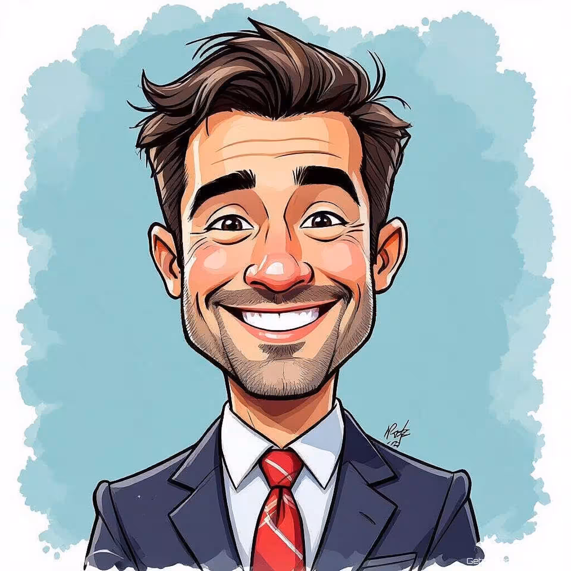 Cartoon zakenman, aquarel illustratie karikatuur kunst, speels sfeer, effen kleur achtergrond, overdreven fysieke kenmerken, humoristische vervorming, expressieve persoonlijkheidskenmerken, helder en levendig kleuren, speelse overdrijving, professionele cartoonillustratie, onderscheidend karakterontwerp, komische portretstijl