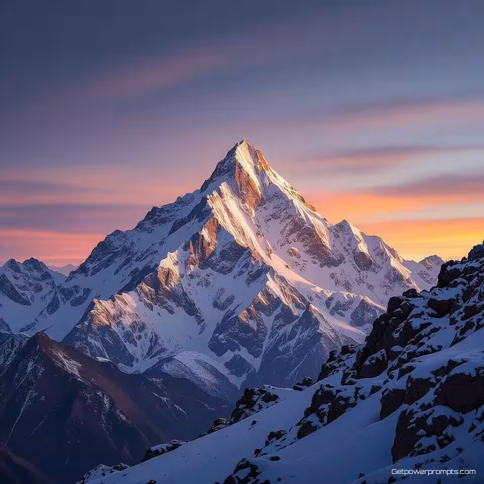 Besneeuwde bergtop, dramatische bergfotografie, schilderkunst stijl, gouden uur belichting belichting, breedhoek perspectief perspectief, epische sfeer atmosfeer, aardse kleurenpalet, ruig terrein, professionele natuurfotografie, gedetailleerde rotstexturen, atmosferische omstandigheden, majestueuze pieken, natuurlijke wildernis