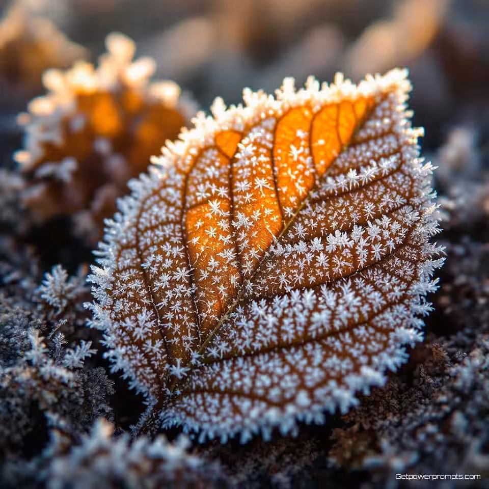 Rijp patronen op blad, macrofotografie, fotorealistisch, natuurlijk ochtendlicht belichting, extreem close-up perspectief, aardse tonen, gedetailleerde texturen, natuurlijke patronen, professionele natuurfotografie, kleine scherptediepte, selectieve scherpstelling, ingewikkelde oppervlaktedetails