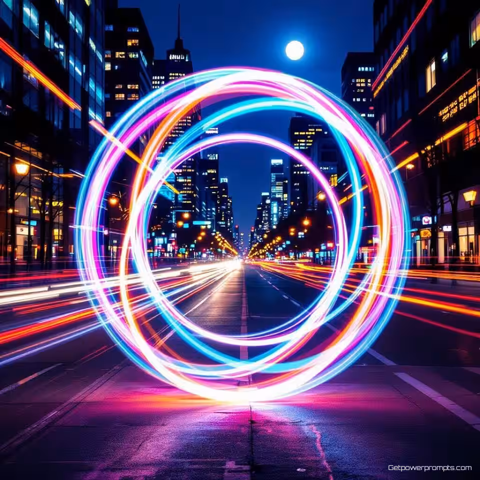 Lichtbol, langbelichting fotografie, lichtschilderkunst, stedelijk stadsgezicht achtergrond, maanlicht verlichting, levendige regenboog, bewegingsonscherpe effecten, creatieve lichtsporen, artistieke lichtpatronen, dynamische compositie, nachtfotografie