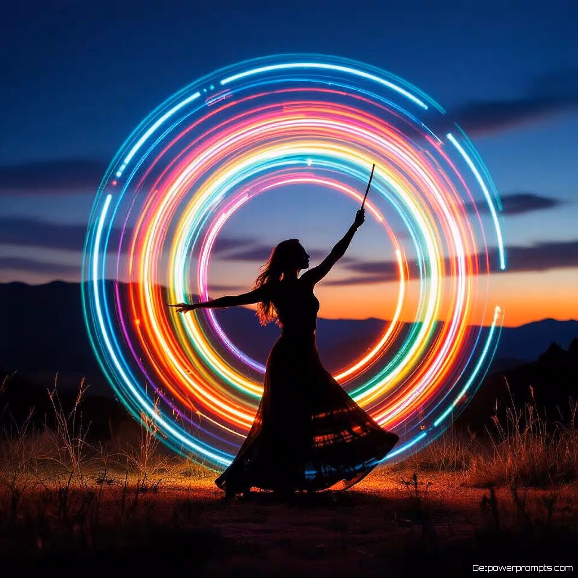 Silhouet figuur met LED poi, lange belichting fotografie, LED poi draaien, natuurlijk landschap achtergrond achtergrond, maanlicht ambient verlichting, regenboog spectrum, cirkelvormige lichtpatronen, kinetische lichtkunst, draaiende bewegingssporen, verlengde belichting, dynamische lichtperformance, dynamische hoek perspectief, energieke sfeer atmosfeer, gloeiende bolsporen, ritmische beweging vastgelegd