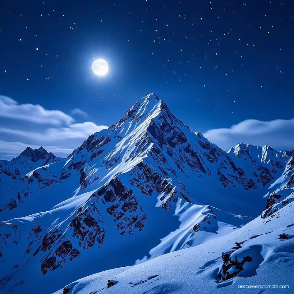 Met sneeuw bedekte bergtop, nachtlandschapsfotografie, laaghoekperspectief perspectief, helder maanlicht verlichting, koele blauwe nachtkleuren, natuurlijke omgeving, sfeervol, lange belichtingstijd, gedetailleerde terreinkenmerken, dramatische nachtelijke hemel