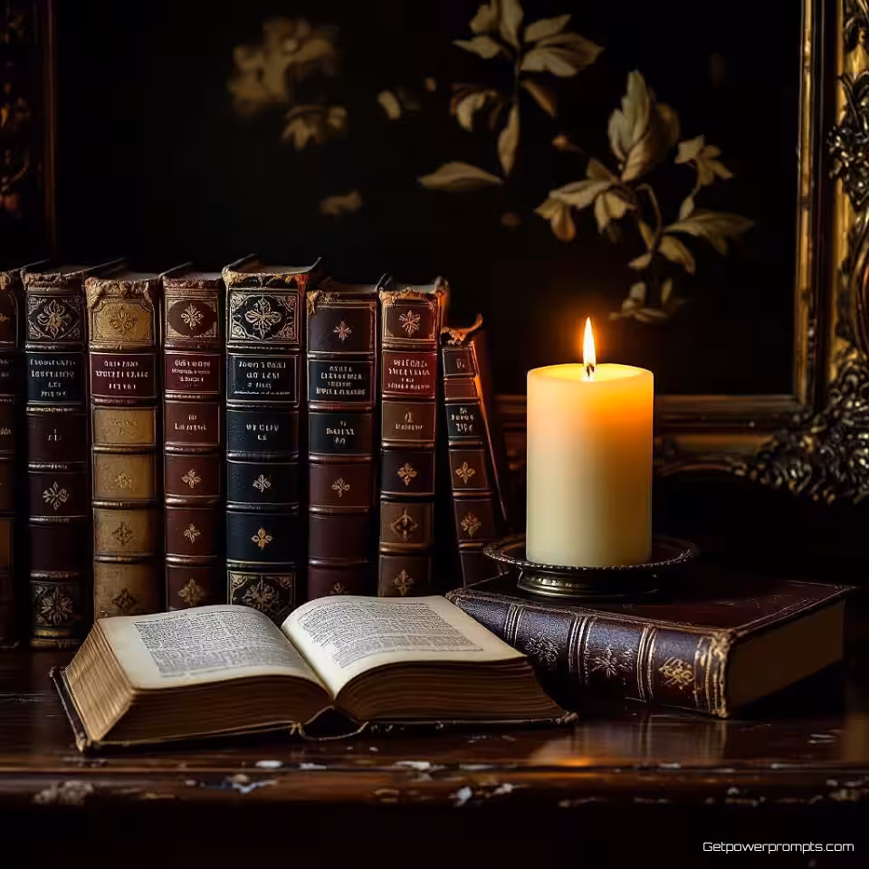 antieke boeken en kaars, fijne kunst stilleven fotografie, oude meester schilderij esthetiek, gecentreerde compositie perspectief, clair-obscur verlichting verlichting, rustig en vredig atmosfeer, artistieke opstelling, museumkwaliteit, galerijpresentatie