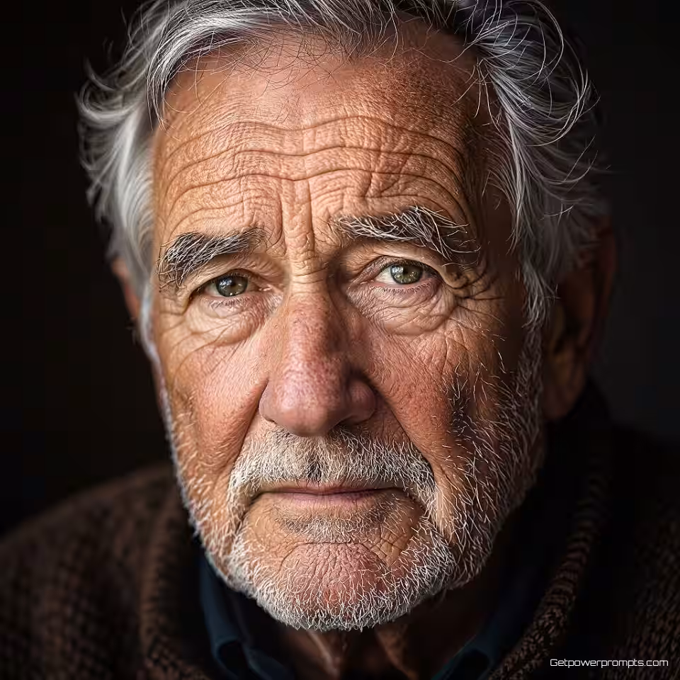 Oudere man met karakterlijnen, fotografie van fijne kunst portretten, moderne fijne kunst esthetiek, close-up portret perspectief, dramatische clair-obscur belichting belichting, melancholische sfeer atmosfeer, artistieke expressie, galerij kwaliteit, emotionele diepte, warme gouden tonen tonen