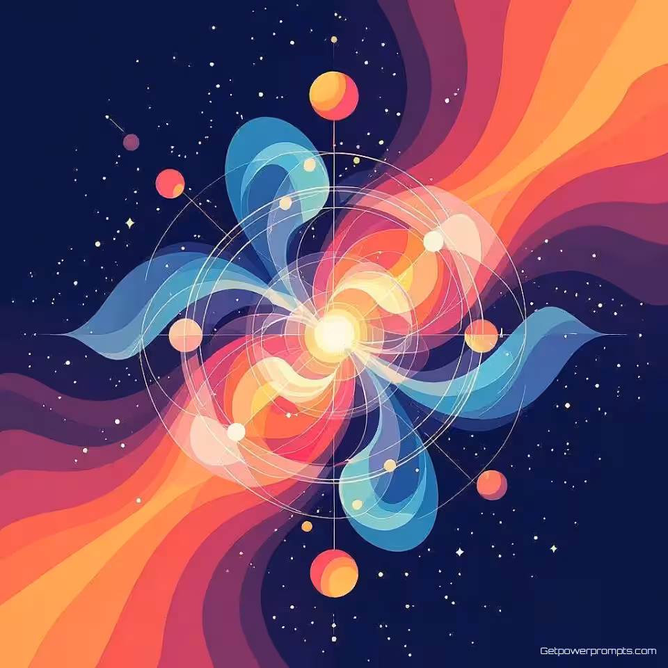 Deze beschrijving schetst een levendige en moderne vectorillustratie die de kosmische energie uitbeeldt. Het kunstwerk is minimalistisch en gebalanceerd opgebouwd, met geometrische vectorelementen die abstract en eigentijds overkomen. De heldere, levendige kleuren zorgen voor een dynamische visuele compositie, terwijl schone vectorlijnen en een effen achtergrond een strakke en schaalbare esthetiek bieden. Het resultaat is een eigentijds digitaal kunstwerk dat zowel kracht als elegantie uitstraalt.