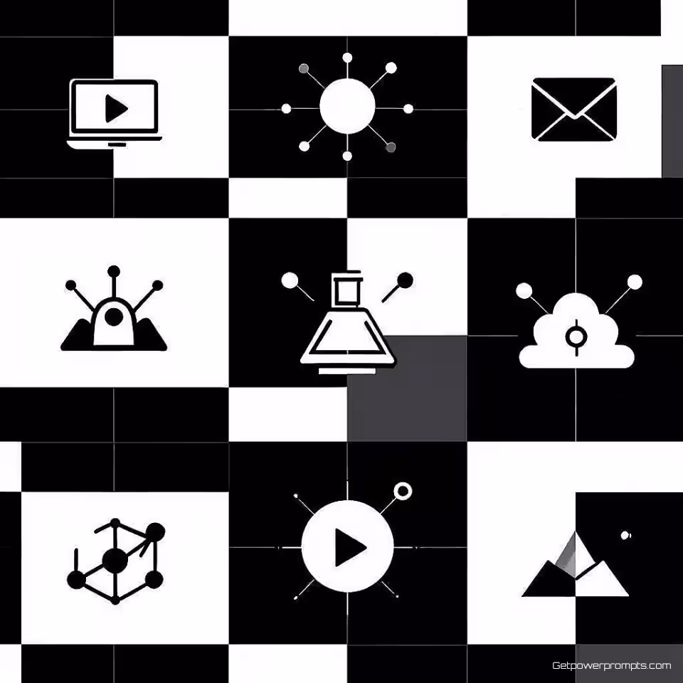Deze beschrijving verwijst naar een minimalistische en moderne vectorillustratie van technologie-iconen. Het ontwerp heeft de volgende kenmerken: