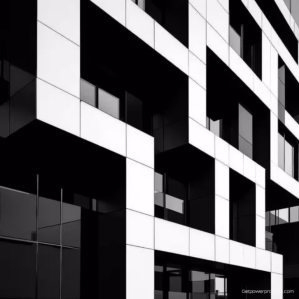Contemporaine gebouwgevel, abstracte geometrische vormen, zwart-wit palet kleurenschema, close-up compositie perspectief, natuurlijke daglicht belichting belichting, architectuurfotografie, geometrische vormen, structurele details, galerij-kwaliteit print, moderne wanddecoratie, minimalistische esthetiek, strakke lijnen, abstracte architectuur, interieurontwerp element