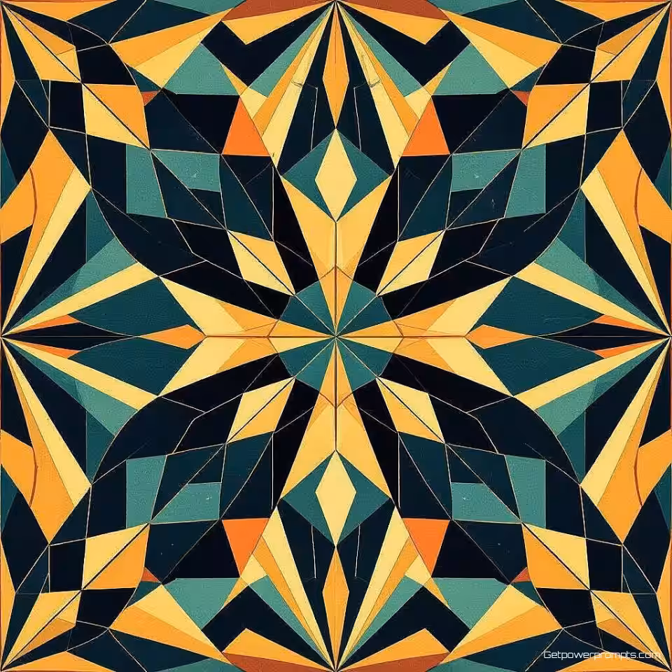 Geometrisch patroon, art deco illustratiestijl, juweeltonen kleurenschema, symmetrisch perspectief, dramatisch verlichting, geometrische patronen, metalen accenten, symmetrisch ontwerp, galerijkwaliteit print, luxe wanddecoratie, vintage glamour esthetiek, decoratieve motieven, elegante lijnen, architectonische elementen, verfijnde kunststijl