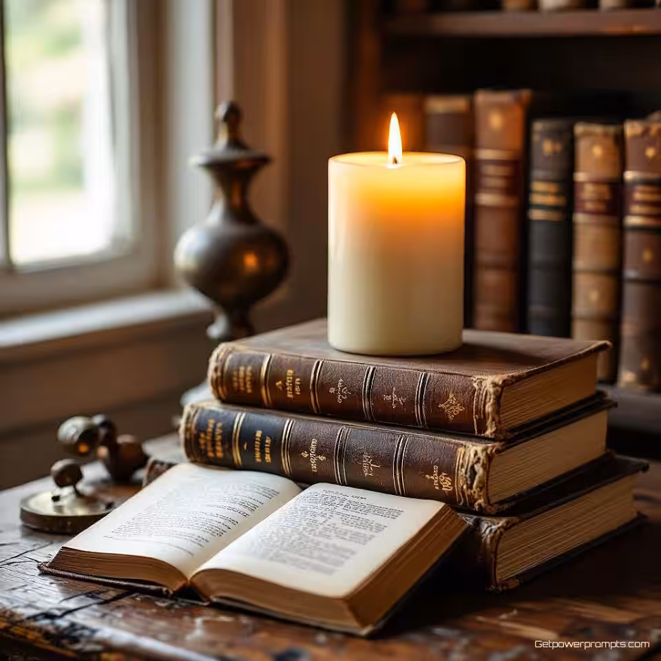 Vintage boeken en kaars, fijne kunst stilleven fotografie, klassiek stijl, gecentreerd perspectief, zacht natuurlijk licht belichting, aards tonen kleurenschema, galerij-kwaliteit print, museum esthetiek, tijdloze compositie, artistieke opstelling, decoratieve wandkunst, professionele fotografie, artistieke expressie