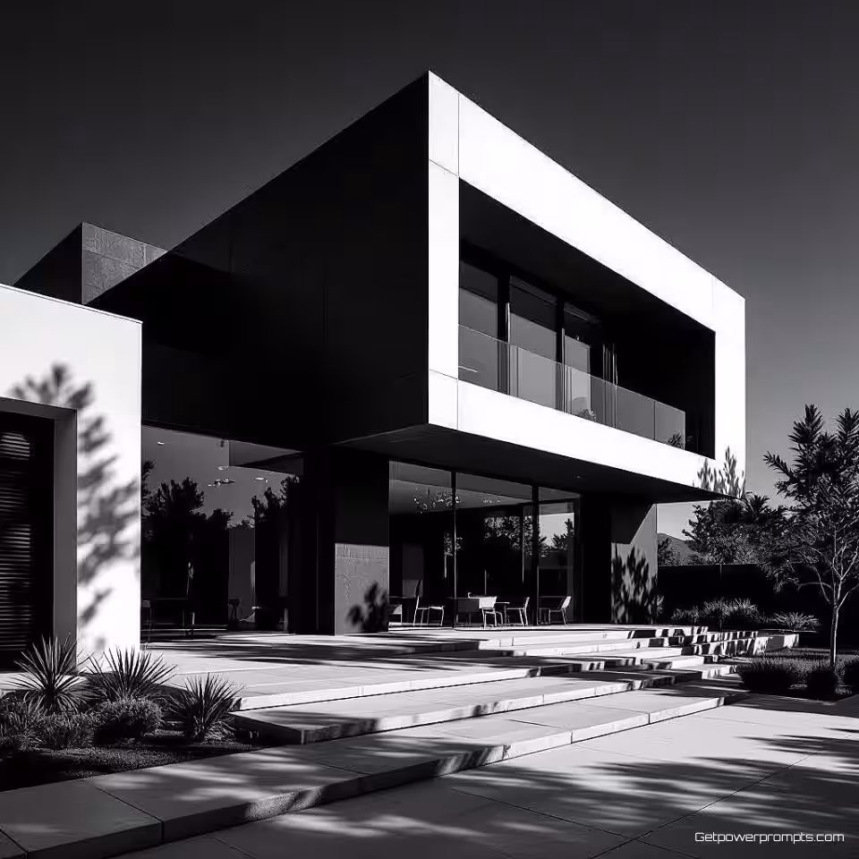 Moderne architectuur gevel, zwart-wit fotografie, groothoek perspectief, dramatische belichting belichting, serieus sfeer, minimalistische esthetiek, hoog contrast, galerij kwaliteit afdruk, fijne kunst wanddecoratie, monochrome tonen, dramatische schaduwen, tijdloze kwaliteit, artistieke expressie