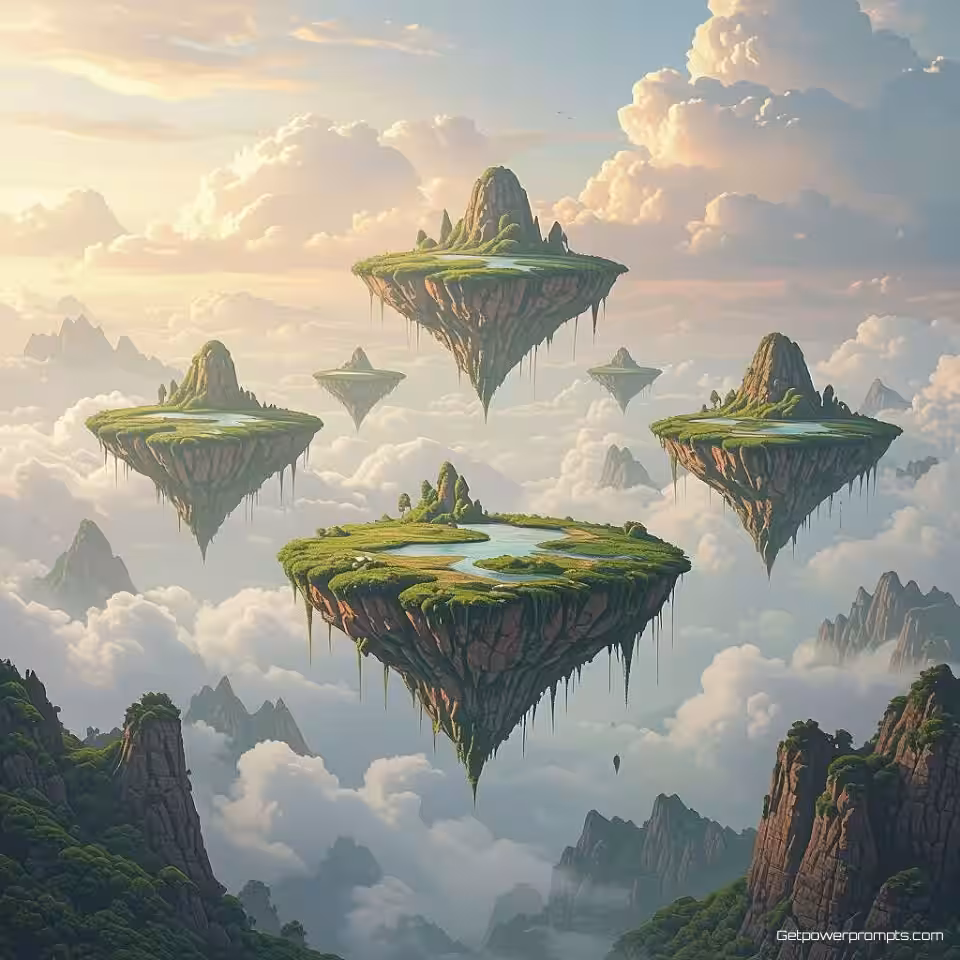 Zwevende eilanden, surreële digitale kunst, gedempte pastels kleurenschema, groothoek perspectief, dramatische verlichting verlichting, droomachtige sfeer, fantasierijke elementen, galeriekwaliteit print, hedendaagse wanddecoratie, digitale schilderstijl, etherische kwaliteit, artistieke expressie