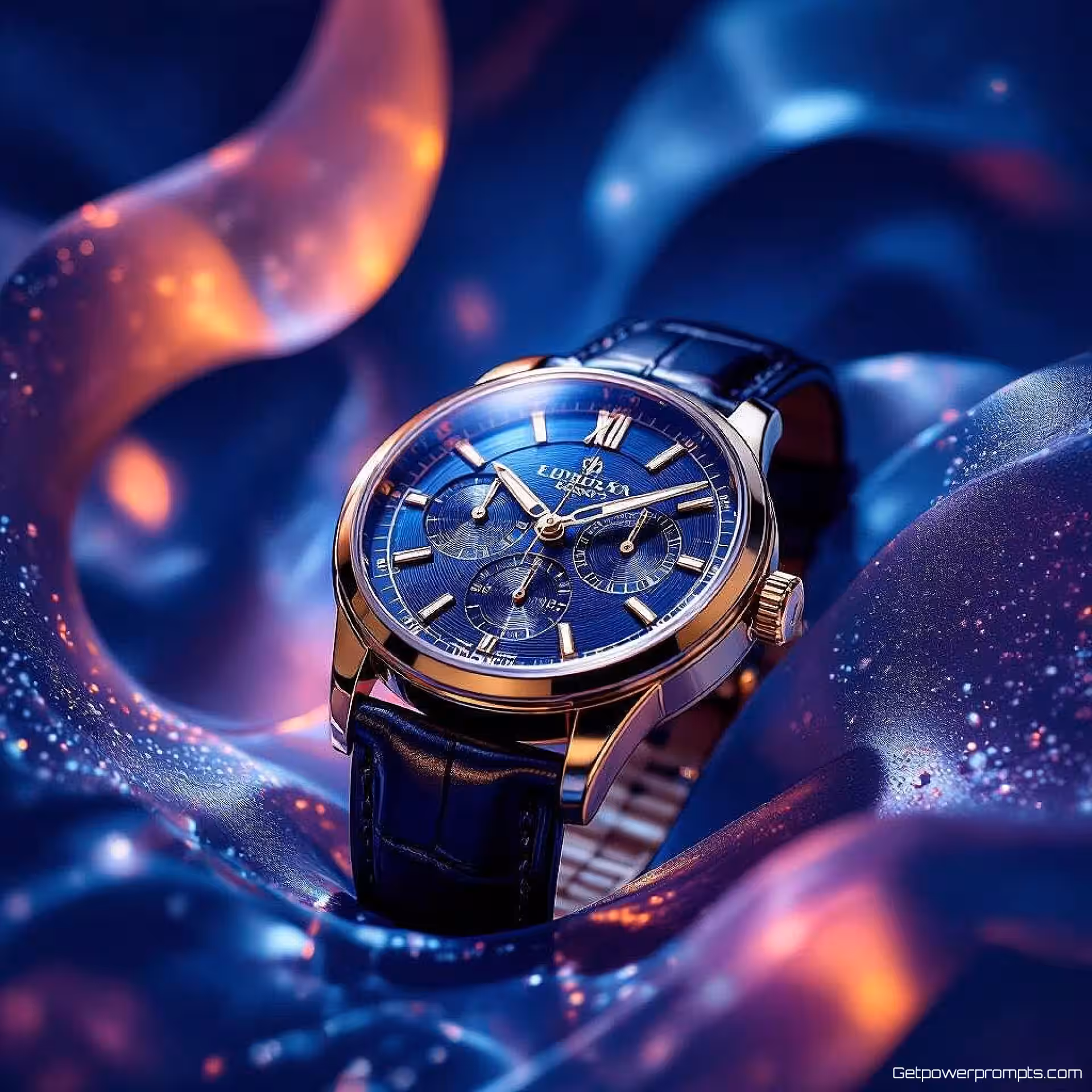 Luxe uurwerk, abstracte merkfotografie, dynamisch en levendig sfeer, intiem en gedetailleerd perspectief, theatrale schaduwen belichting, enkel kleurenschema, geometrische elementen, vloeiende vormen, conceptuele merkidentiteit, professionele marketingvisual, artistieke interpretatie