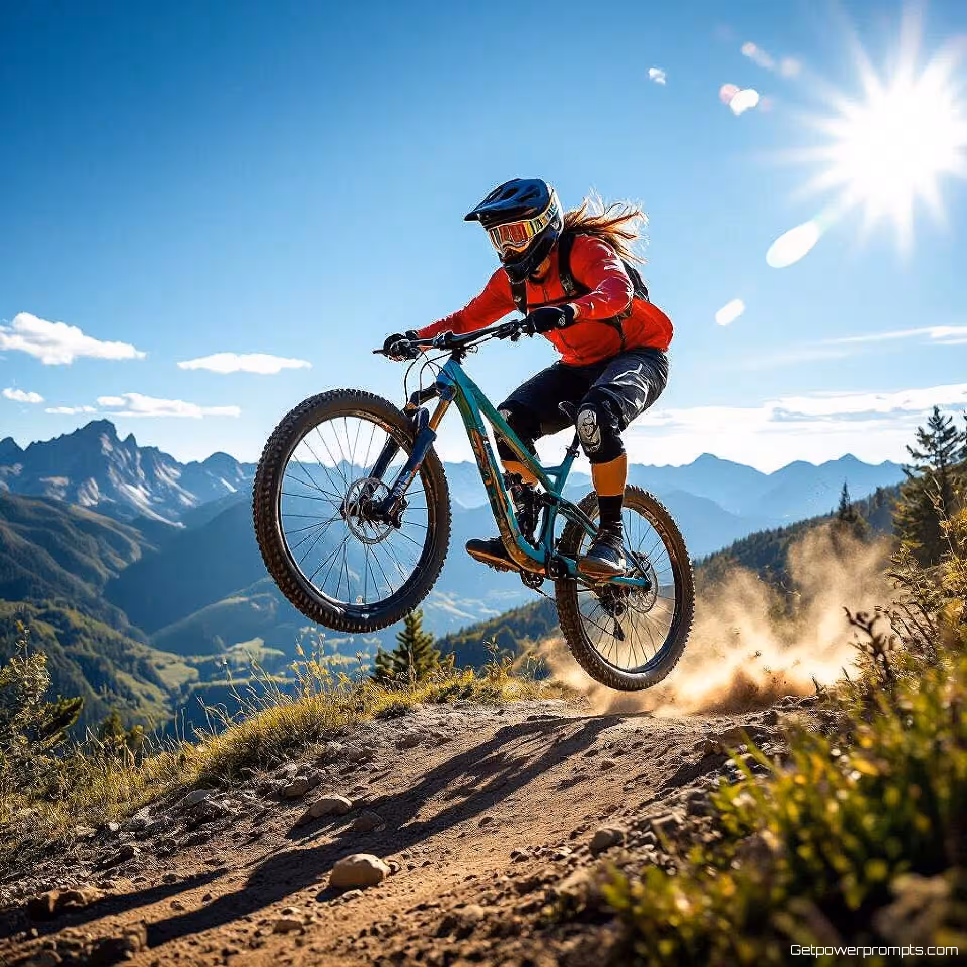 Mountainbiker die over een trail springt, actiesportfotografie, opwindend sfeer, lage hoek perspectief, dramatische zijbelichting belichting, levendige primaire kleuren, bewegingsregistratie, dynamische beweging, professionele campagnevisual, piekactiemoment, atletische energie