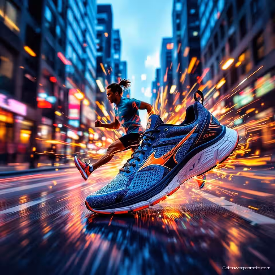 Atletische hardloopschoenen, actiefotografie, hoogenergetisch en levendig sfeer, stadstraat met gebouwen achtergrond, theatrale schaduwen en highlights verlichting, bewegingsonscherpte effect, dynamische compositie, commerciële advertentiestijl, levendige kleuren, energieke beweging, nauwkeurige fotografische weergave
