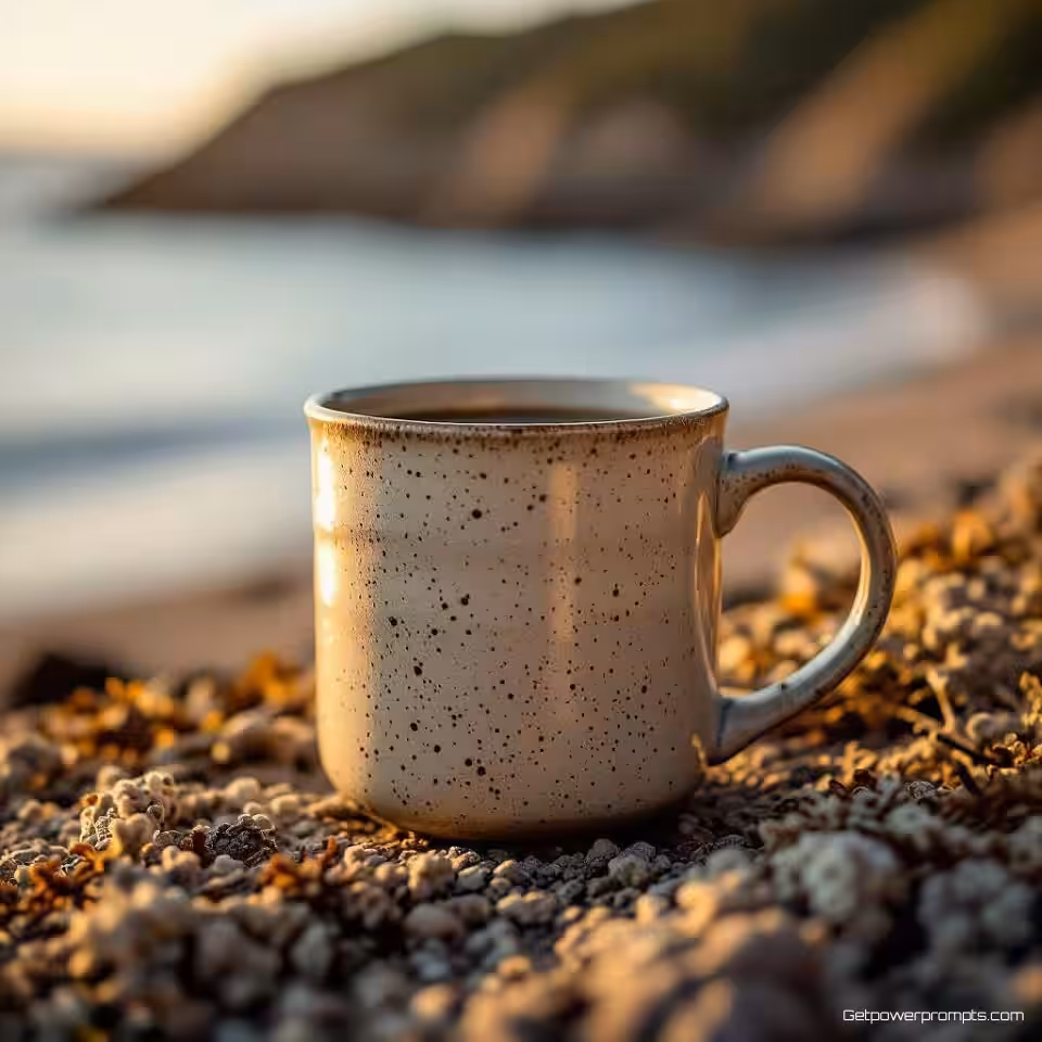 Ambachtelijke koffiemok, natuurgeïnspireerde productfotografie, kustsetting achtergrond, gouden uur belichting belichting, close-up perspectief perspectief, organische elementen, natuurlijke texturen, commerciële reclame-esthetiek, authentieke natuurintegratie, aarde kleurenpalet, omgevingsharmonie
