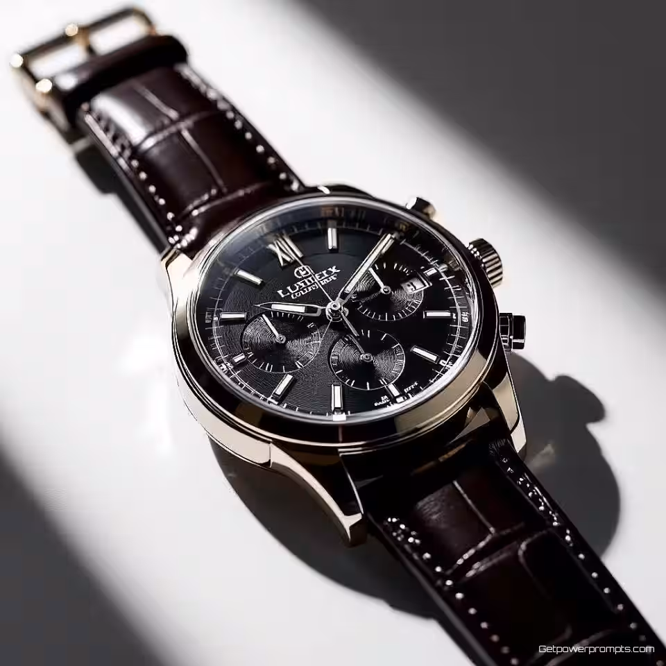 Luxe polshorloge, dramatische productfotografie, dramatische zijbelichting belichting, donkere studio achtergrond achtergrond, sterk schaduwspel, hoog contrast, commerciële reclame, close-up compositie perspectief, scherpe focus, dramatische sfeer atmosfeer, artistieke productpresentatie