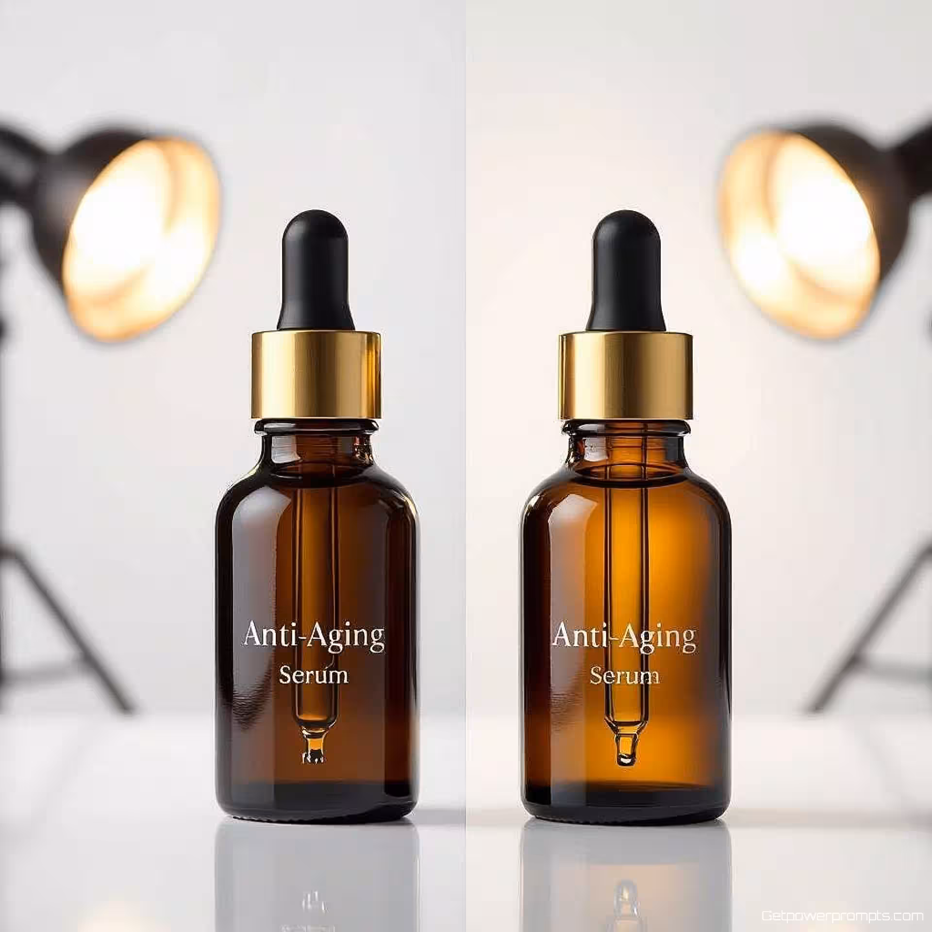 Anti-Aging Serum, split-screen fotografie, schone witte achtergrond achtergrond, professionele studiolampen verlichting, gedetailleerde close-up shot perspectief, zij-aan-zij vergelijking, commerciële advertentie-esthetiek, professionele productweergave, scherpe focus, zwart-wit kleurenschema, visueel contrast, moderne marketinglay-out