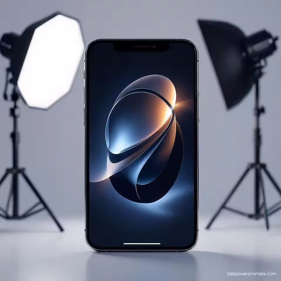 Een verbluffende hero shot van een smartphone, vastgelegd in een fotorealistische stijl. De telefoon staat centraal tegen een egale witte studio-achtergrond. Het wordt verlicht door een dramatische studiobelichting die diepe, expressieve schaduwen en heldere hooglichten creëert, wat zorgt voor een intense en theatrale sfeer. Het perspectief is een close-up, waardoor elk detail van het ontwerp, de materiaaltextuur en de afwerking nadrukkelijk zichtbaar is. De presentatie is uiterst dramatisch en legt alle nadruk op het product, wat resulteert in een visueel diepgaande en krachtige productpresentatie. De esthetiek is puur professioneel en marketinggericht, met een vlijmscherpe focus op het apparaat. De algehele uitstraling heeft een sterke commerciële aantrekkingskracht en straalt een premium, hoogwaardige visuele presentatie uit die perfect is voor campagnes en reclame-uitingen.