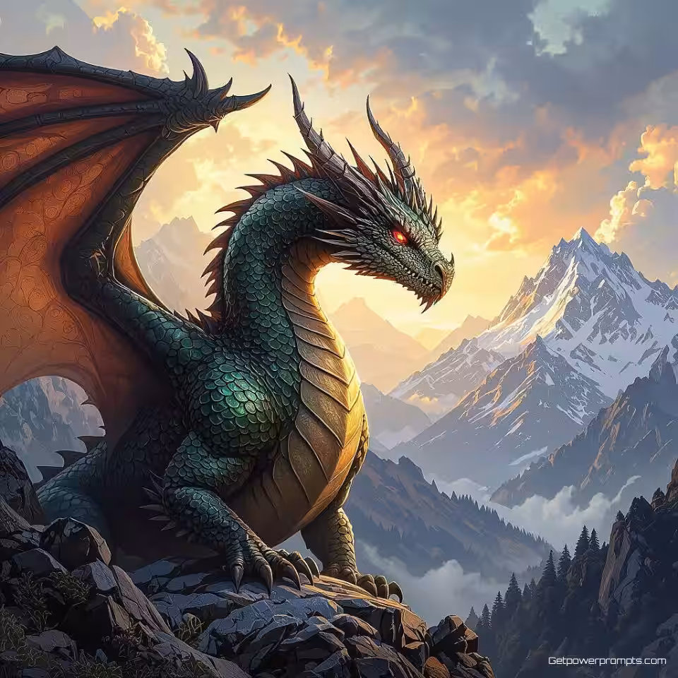Oude draak, digitale schildering, episch sfeer, berglandschap achtergrond, dramatisch belichting, epische fantasy boekomslag, gedetailleerde illustratie, cinematografische compositie, rijk en levendig