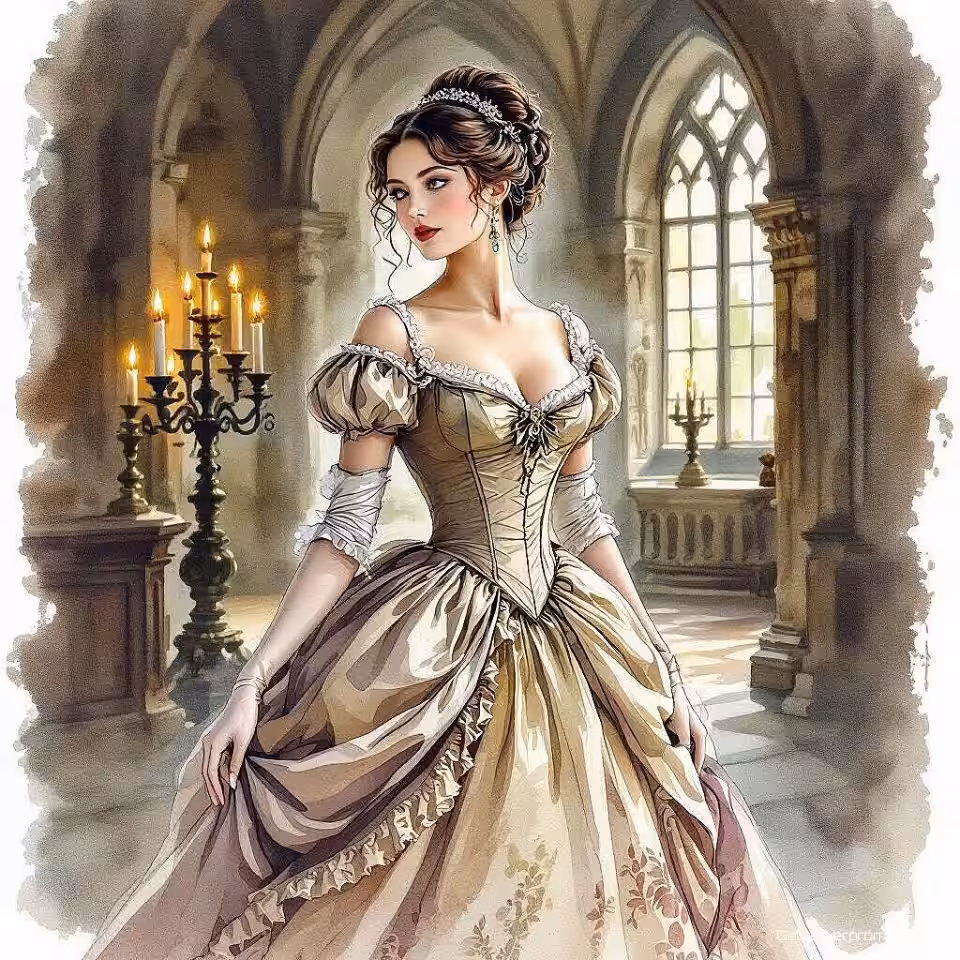 Regency era dame in baljurk, aquarel illustratie, dramatische sfeer sfeer, historische fictie boekomslag, kasteel interieur achtergrond, periode-accurate details, zacht daglicht belichting, aarden tinten palet, professionele publicatiekwaliteit, vintage esthetiek, authentieke historische elementen