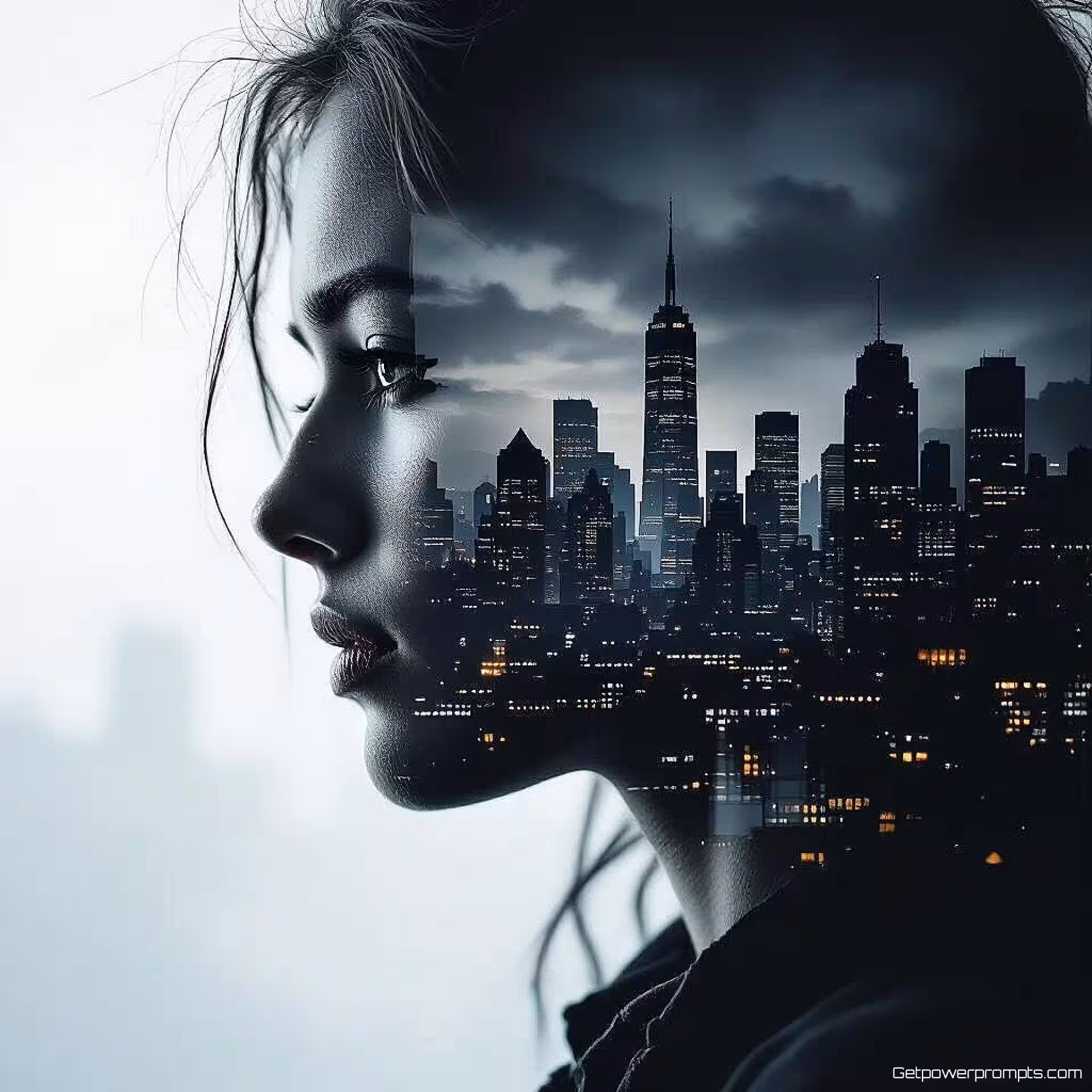 Menselijk portret met stedelijke skyline, dubbele belichting fotografie, illustratie stijl, close-up perspectief, zacht natuurlijk licht verlichting, dromerig atmosfeer, redactionele magazine esthetiek, monochroom met accenten, gelaagde compositie, artistieke vermenging, conceptueel verhalen vertellen, professionele magazine feature, visueel narratief, creatieve overlay