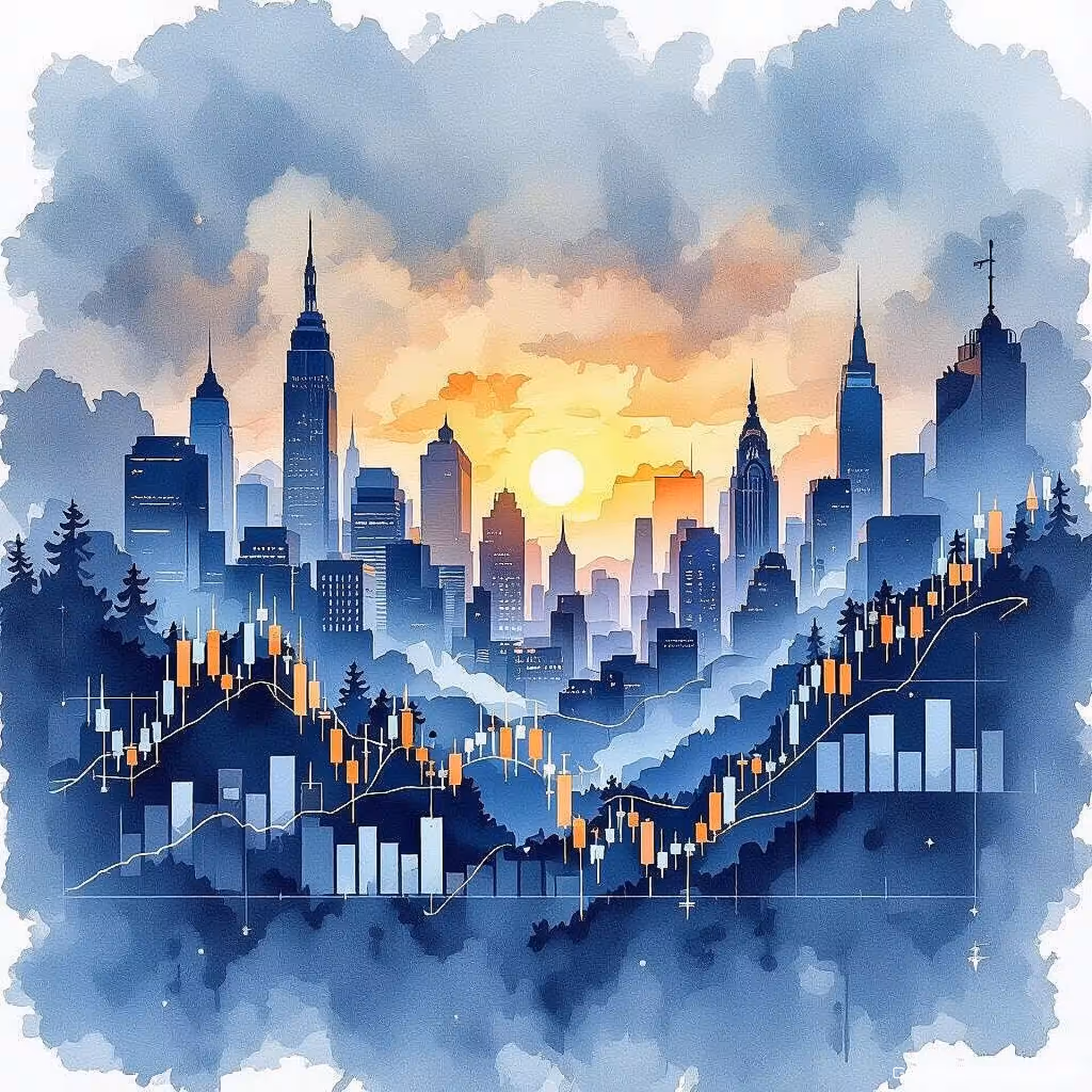 Aandelenmarktprestatiegrafiek, aquarelstijl, professionele zakelijke sfeer sfeer, blauwe en grijze tinten, redactionele financiële illustratie, datavisualisatie-elementen, economische verhaallijn, tijdschriftlay-out gereed, professioneel kunstwerk, schoon infographic-ontwerp, publicatiekwaliteit, moderne financiële grafieken
