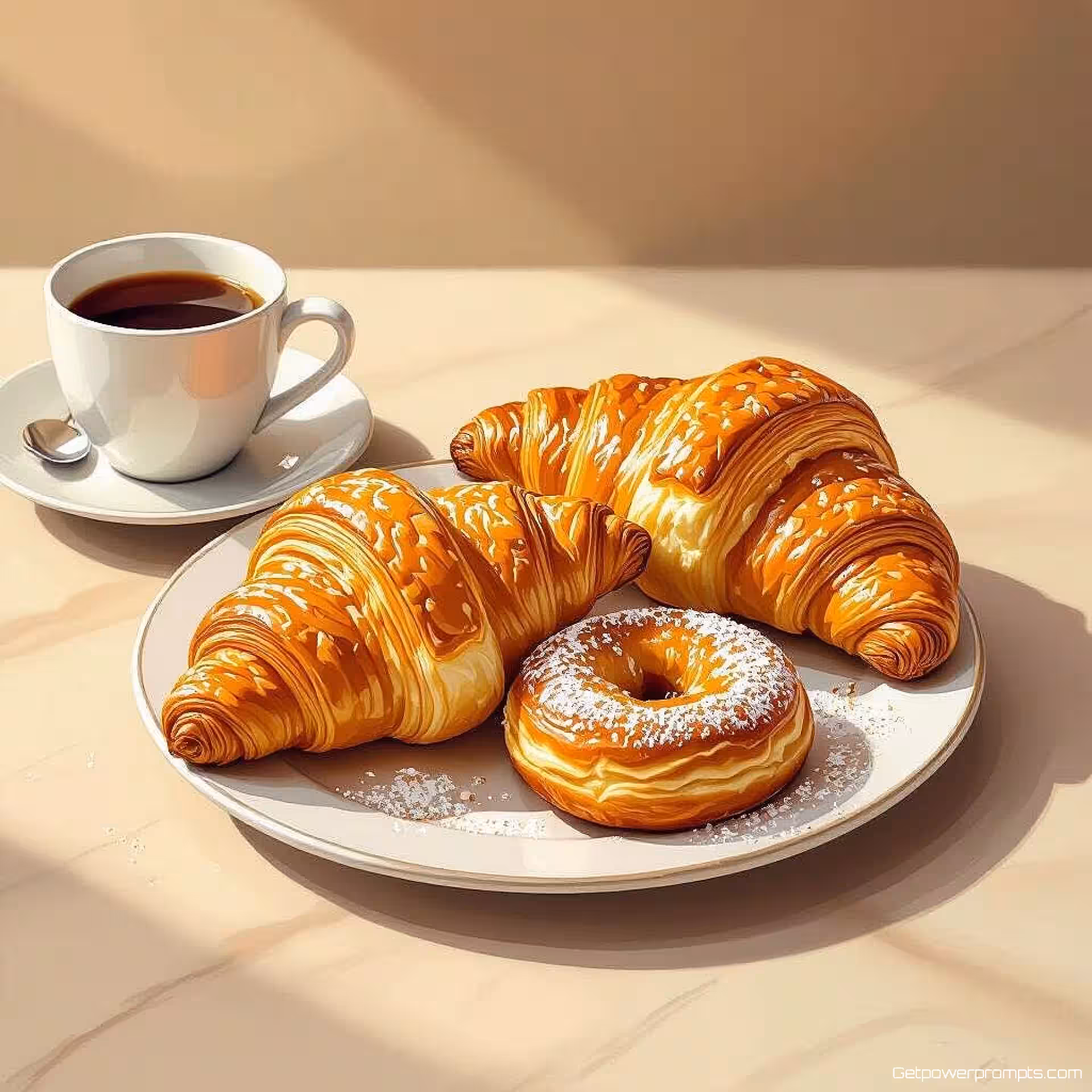 Verse croissants en gebakjes, digitale schilderstijl, warme en uitnodigende sfeer sfeer, close-up perspectief perspectief, warme aardtinten palet, redactionele voedselillustratie, klaar voor tijdschriftopmaak, professioneel kunstwerk, culinaire verhaalvertelling, verleidelijke presentatie, publicatiekwaliteit, schone stijl