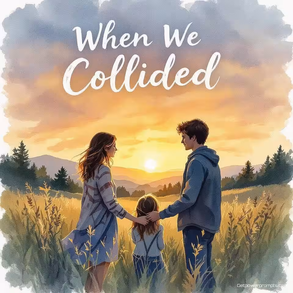 When We Collided, aquarel schilderij young adult fictie ebook omslag, natuurlijk landschap achtergrond, dramatische verlichting verlichting, dromerig sfeer, coming-of-age esthetiek, emotioneel verhaal, karaktergedreven ontwerp, subtiele symboliek, hedendaagse typografie, professionele publicatiestijl, authentieke jeugdrepresentatie