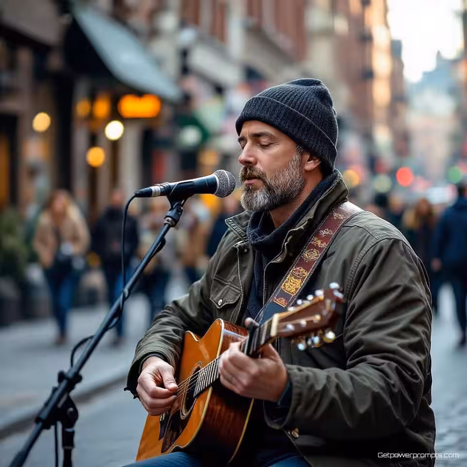 Straatmuzikant die optreedt, documentaire fotografie, actiemoment perspectief, natuurlijk daglicht belichting, authentiek moment sfeer, fotojournalistieke stijl, authentiek moment, omgevingsverhaal, natuurlijke kleurcorrectie, contextuele achtergrond, professionele redactionele kwaliteit, spontaan realisme