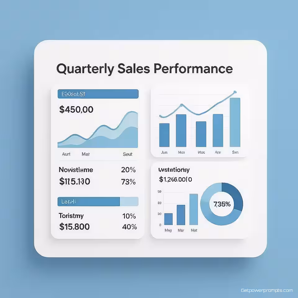 Kwartaal verkoopprestaties, vlak ontwerp, gradiënt achtergrond achtergrond, zacht licht verlichting, zakelijk blauw kleurenschema, modern infographic ontwerp, schone datavisualisatie, professionele presentatiedia, gecentreerde compositie, zakelijke esthetiek, subtiele schaduwen, minimalistische lay-out