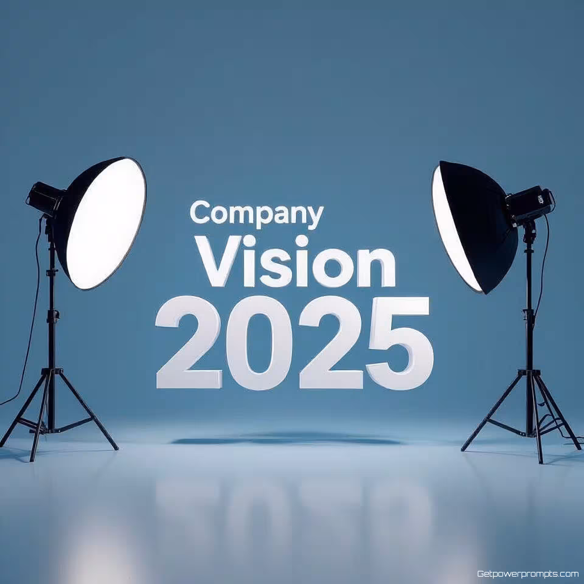 Bedrijfsvisie 2025, 3D render, verloop achtergrond achtergrond, studiobelichting verlichting, blauw en wit kleurenschema, presentatiedia hero visueel, gedurfde typografie, moderne zakelijke esthetiek, schone compositie, professionele dia-ontwerp, gecentreerde lay-out, subtiele kleurverlopen, zachte schaduwen