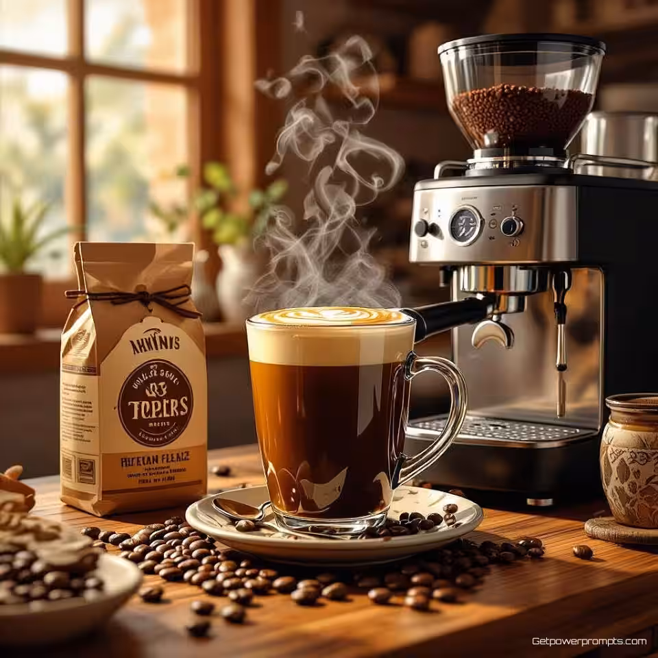 Hier is een beschrijving voor een fotorealistische close-up van ambachtelijke koffieproducten, perfect voor een Instagram-carrousel: