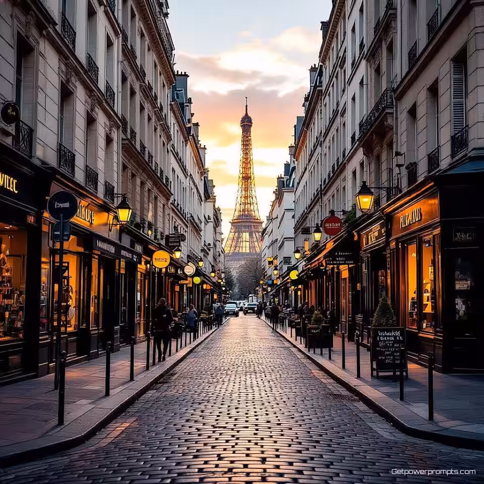 Parijse straat, reisfotografie, fotorealistisch, groothoek perspectief, gouden uur belichting, stedelijke achtergrond achtergrond, aards kleurenpalet, ondiepe scherptediepte, wanderlust esthetiek, Instagram feed optimalisatie, authentieke reiservaring, culturele onderdompeling, professionele reisinhoud, sociale media wanderlust