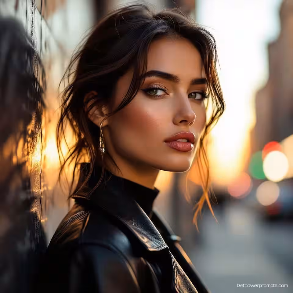 Mode model, cinematische portretfotografie, stedelijke omgeving achtergrond, dramatische zijbelichting belichting, close-up perspectief, aards kleurenschema, Instagram story formaat, dramatische sfeer, ondiepe scherptediepte, professionele styling, sociale media esthetiek, boeiend visueel verhaal