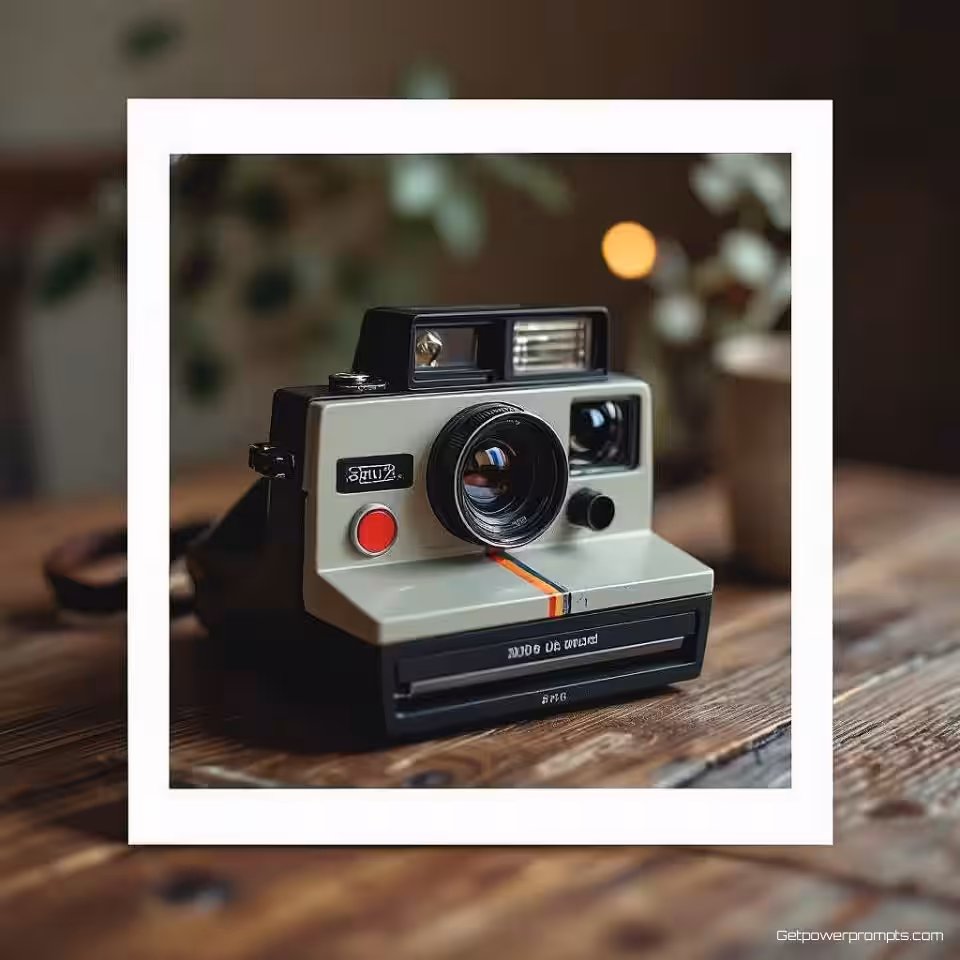Vintage filmcamera, retro polaroid fotografie, nostalgisch sfeer, houten tafel achtergrond, zacht natuurlijk licht verlichting, instant film esthetiek, polaroid kader, vintage filter, Instagram story formaat, nostalgische compositie, ondiepe scherptediepte, authentiek moment