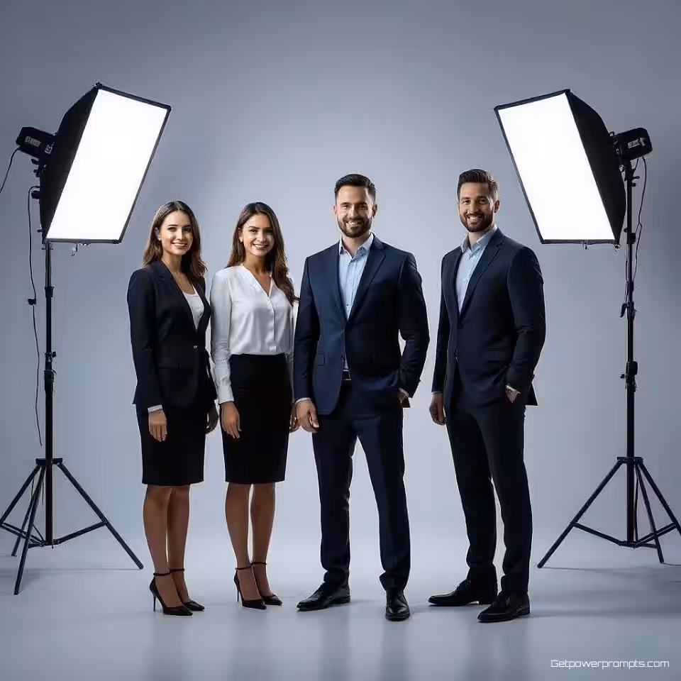 Professioneel zakelijk team, fotorealistische fotografie, professionele sfeer sfeer, gradiënt achtergrond achtergrond, zachte belichting belichting, professionele LinkedIn header, breedbeeldformaat, zakelijke esthetiek, schone compositie
