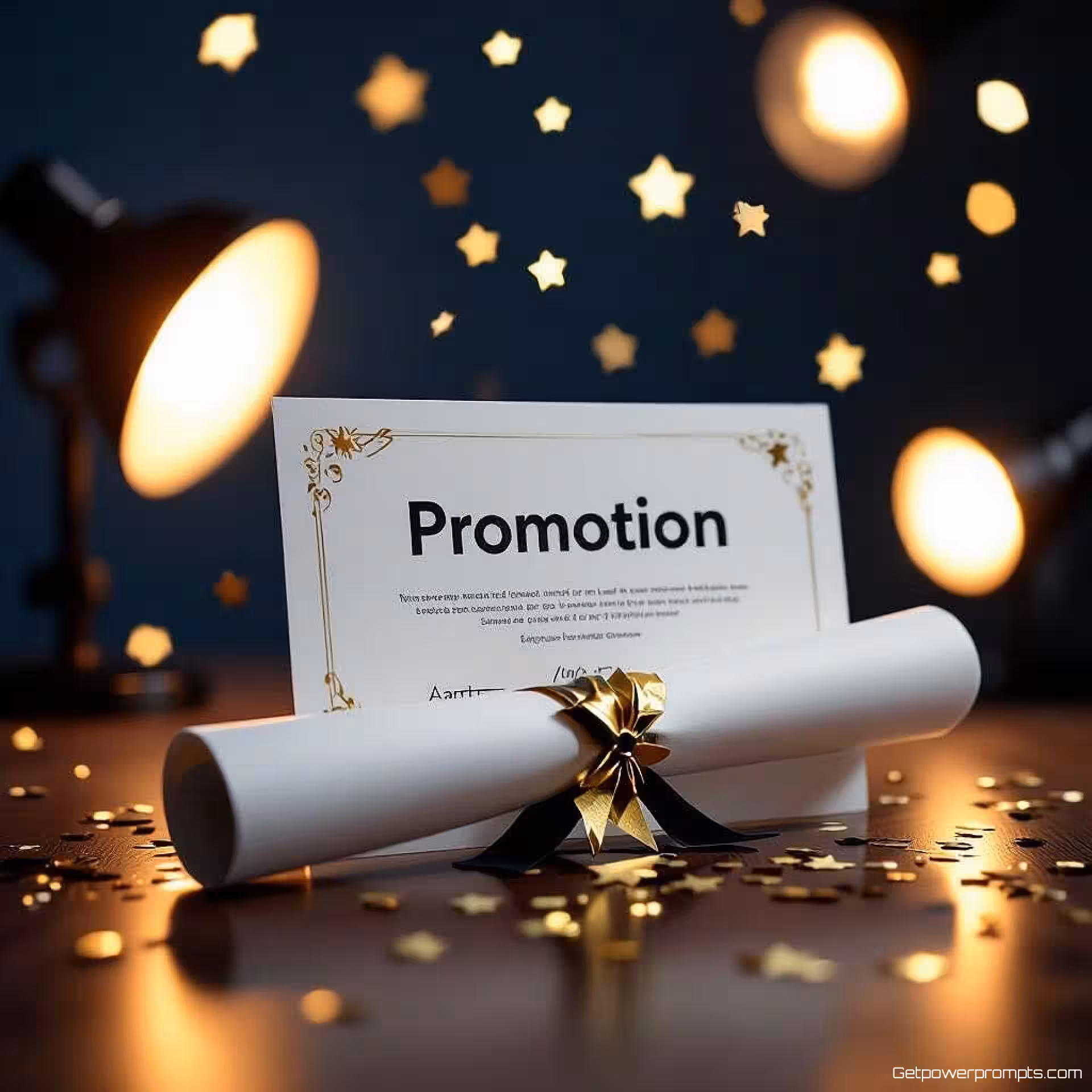 Promotie certificaat, fotorealistisch, feestelijk sfeer, effen kleur achtergrond, zacht diffuus verlichting, professionele LinkedIn vieringspost, close-up perspectief, mijlpaal markeringselementen, prestatievisualisatie, moderne zakelijke esthetiek, schoon professioneel ontwerp, carrièreprestatie visueel