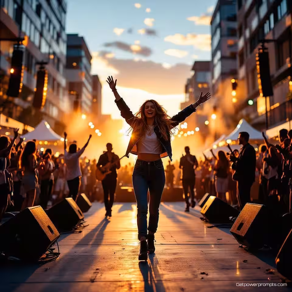 Muziekfestival, fotorealistisch, stedelijke omgeving achtergrond, gouden uur verlichting, close-up perspectief, social media inhoud, vrolijk sfeer, authentiek moment, professionele fotografie, dynamische compositie, levendige energie