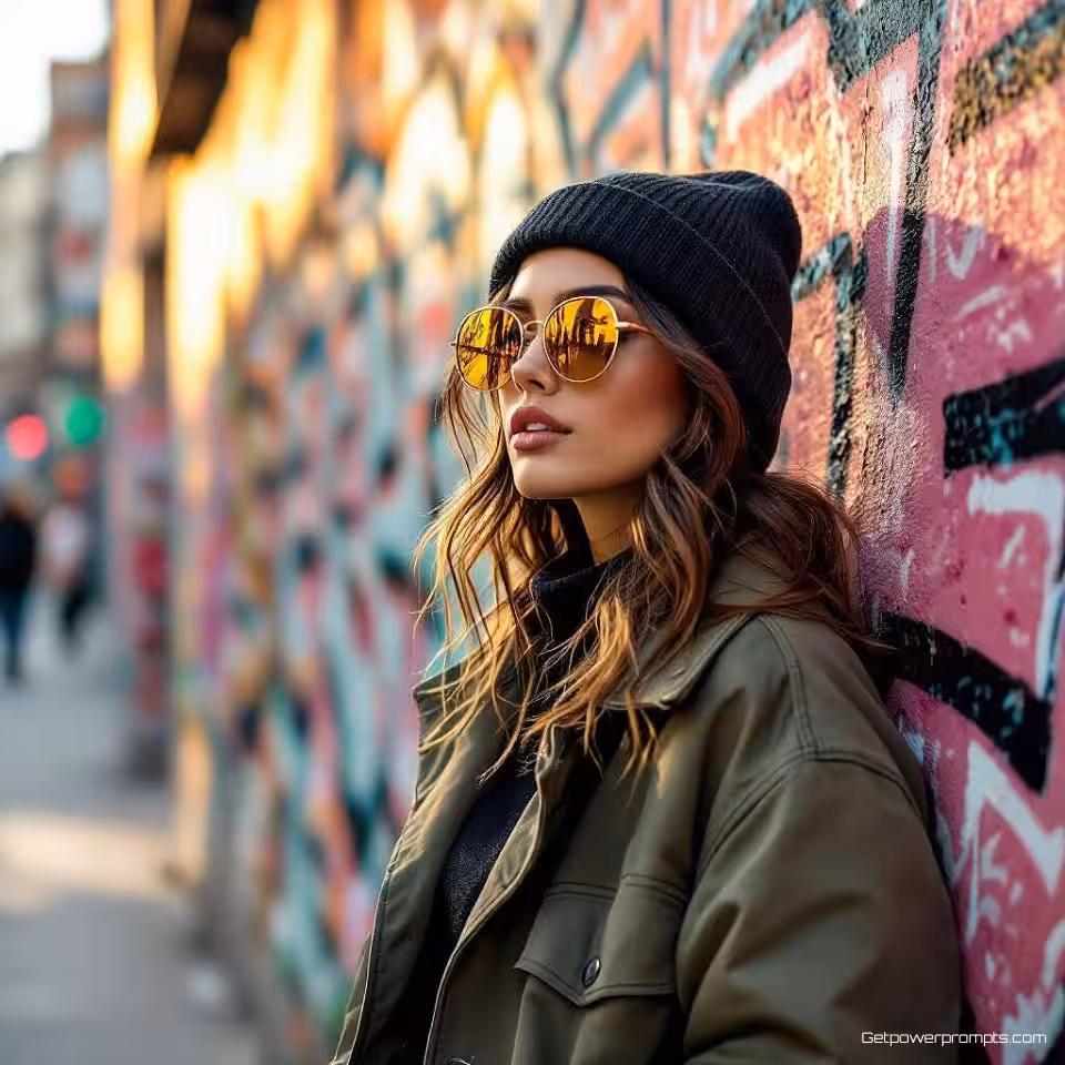 Straatmode model, stedelijke straatfotografie, energiek sfeer, graffiti muur achtergrond, gouden uur verlichting, close-up perspectief, dynamische hoeken, levendige straatkunst, authentieke stedelijke esthetiek, trending TikTok-miniatuur, krachtige visuele impact, bewegingsonscherpe effect, spontane straatstijl