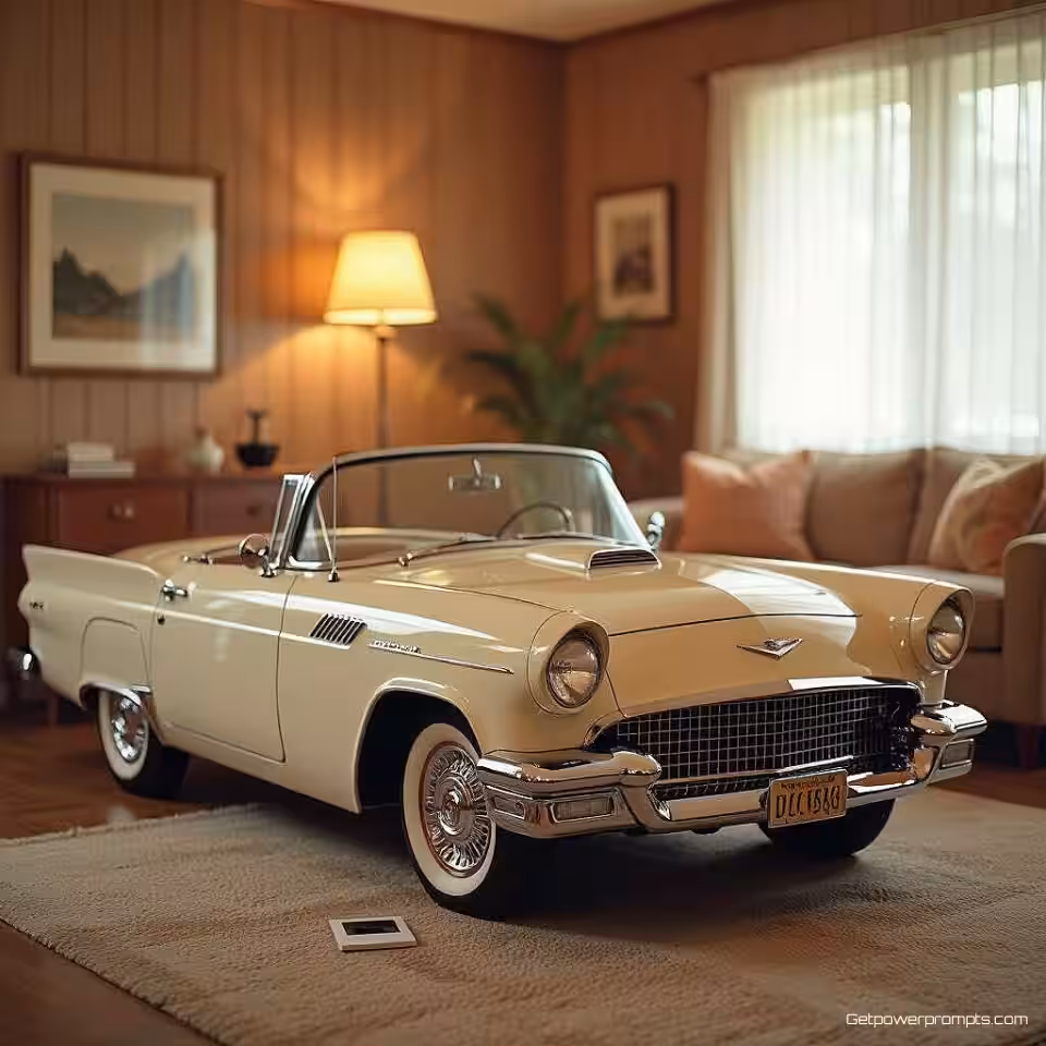 Cabriolet auto uit de jaren 50, polaroid momentopname fotografie, sepia kleurenpalet, woonkamer jaren 70 achtergrond, zacht natuurlijk licht belichting, nostalgische sfeer sfeer, breed panoramisch compositie, X header afmetingen, filmkorrel textuur, nostalgische esthetiek, ondiepe scherptediepte
