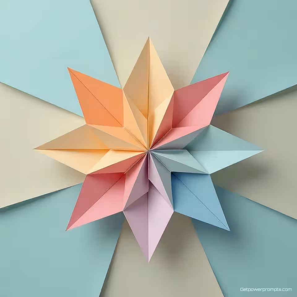 Abstracte vorm, digitale illustratie, speels sfeer, effen kleur achtergrond, zacht licht belichting, digitale origami illustratie, gevouwen papier esthetiek, geometrische papieren vormen, schone papieren randen, pastel kleuren, gecentreerde compositie, papieren sculptuurkunst, minimalistisch papieren ontwerp, driedimensionale papieren kunst, scherpe papieren vouwen, hedendaagse ambachtelijke stijl, digitale papieren kunst, origami-geïnspireerd ontwerp, precieze papieren geometrie, papieren schaduwspel