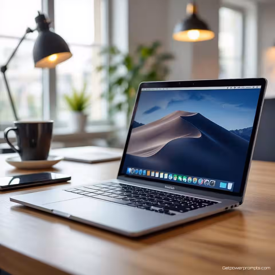 Professionele bureauopstelling met laptop, fotorealistisch, professioneel sfeer, close-up perspectief, zacht natuurlijk licht verlichting, onscherpe achtergrond omgeving, professionele werkplek detail, authentieke kantooromgeving, natuurlijk omgevingslicht, zachte achtergrondfocus, gedetailleerde werkplek esthetiek