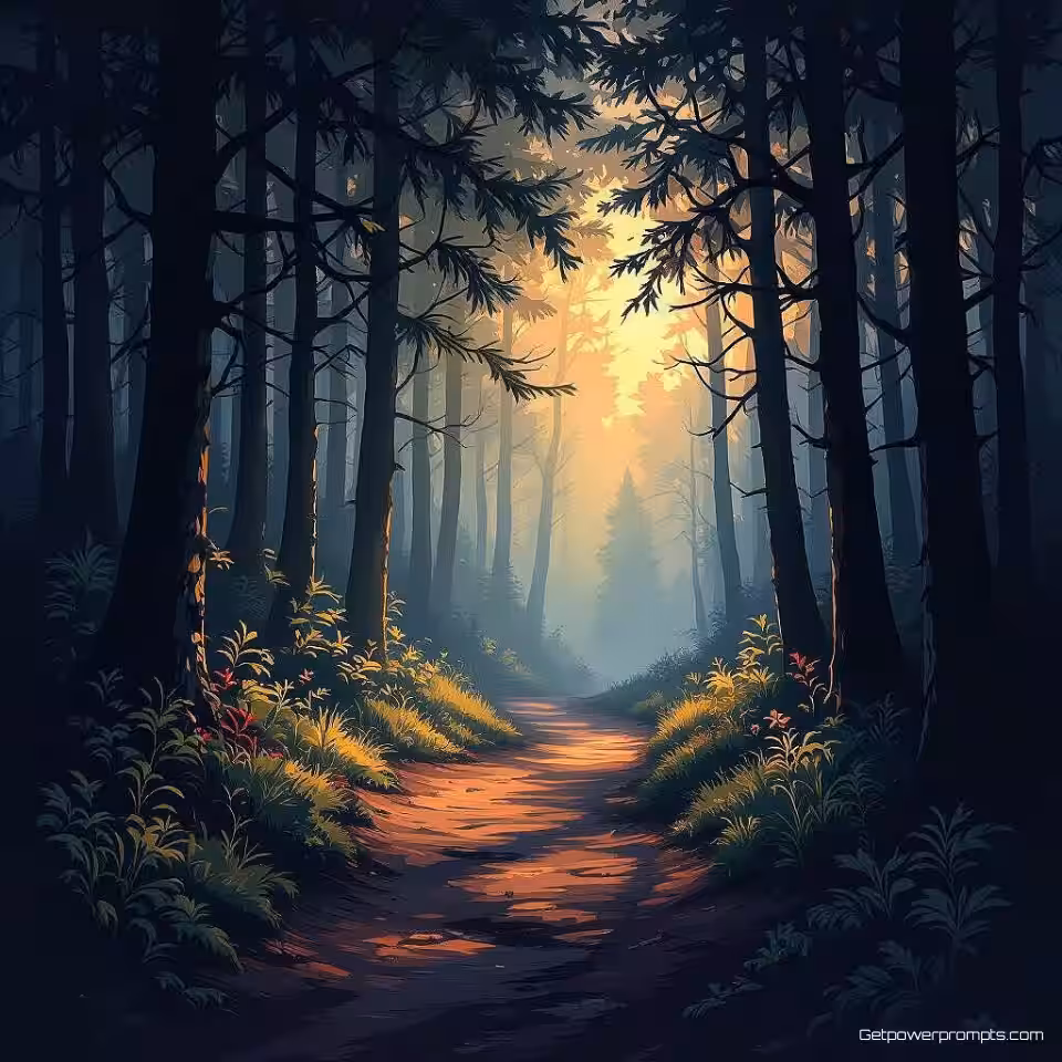 Bosweg bij zonsopgang, digitale schildering, dramatisch sfeer, donkere studio achtergrond, zijlicht verlichting, cinematische compositie, blogkoptekst ontwerp, dramatische schaduwen, professionele presentatie, visuele vertelling, atmosferische diepte