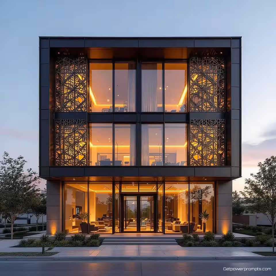 Genereer professionele architectonische hero-afbeeldingen met aanpasbare geometrische elementen, verlichting en kleurenpaletten voor moderne website-ontwerpen