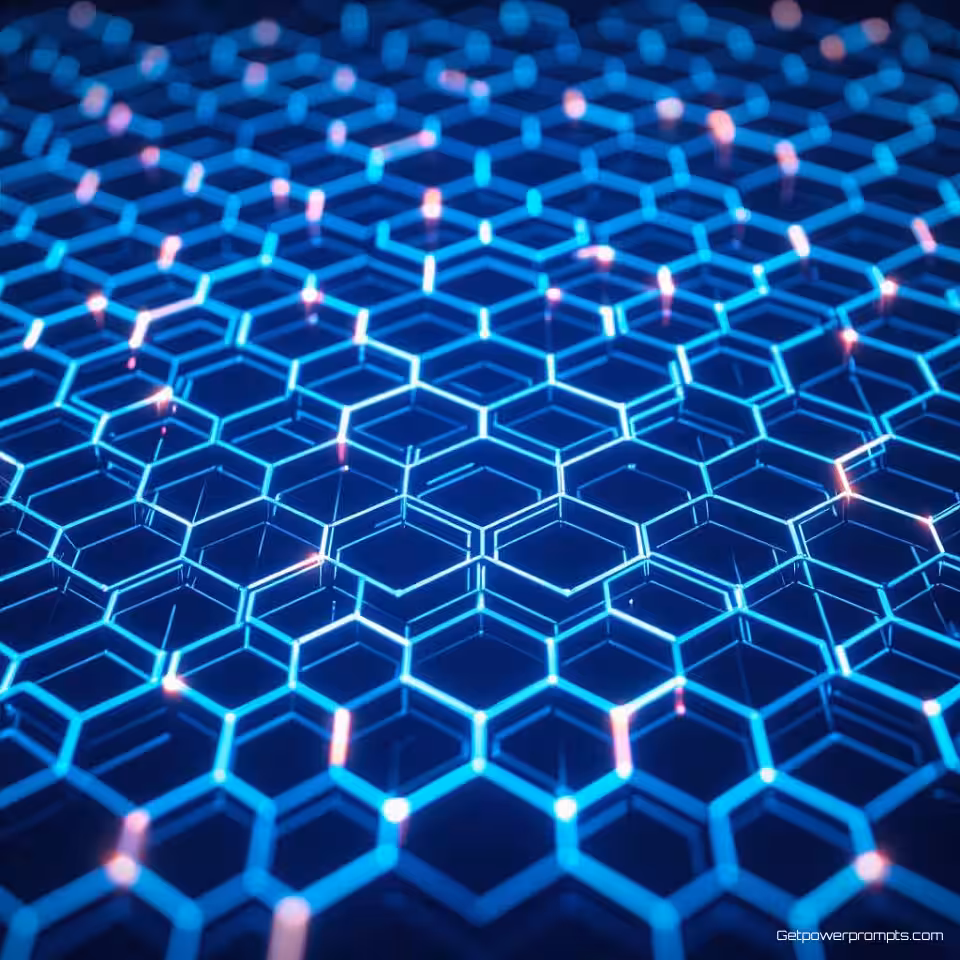 Zeshoekig raster rasterlijnen, digitale kunst, donker verloop achtergrond, blauw neon, zacht gloeien verlichting, subtiele gloeieffecten, geometrische precisie, modern webdesign, schoon esthetisch, professioneel, naadloze integratie, digitaal rastersysteem, futuristische sfeer