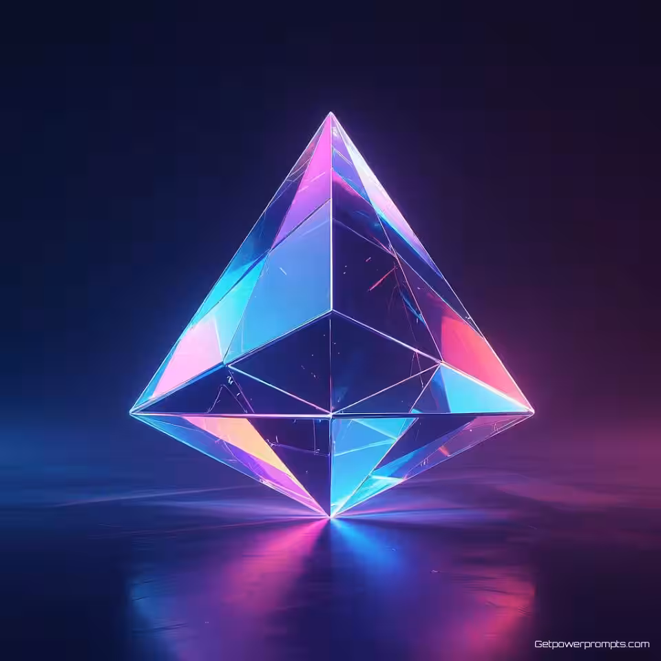 Geometrisch prisma, 3D render, donker verloop achtergrond, neon gloed verlichting, cyberpunk kleuren, holografische gloeieffecten, iriserende oppervlakken, lichtbrekingspatronen, subtiele transparantie, modern webdesign, futuristische esthetiek, professioneel, schone compositie